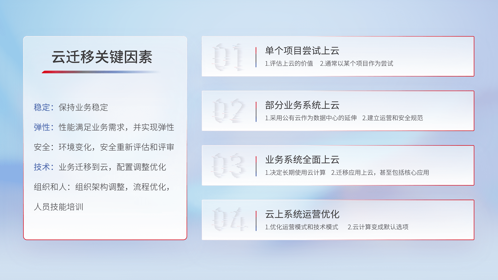 结合实际业务,,,从规划设计、、、、云平台选型、、云原生改造、、、数据迁移、、、、集成交付,,,迁移全过程为客户识别最佳上云路径,,,,做好风险识别管理,,,,设计网络架构、、、身份权限、、、安全审计合规、、操作审计、、日志审计、、监控告警策略、、、多站点容灾设计等,,,对云上基础设施进行整体规划,,提升IT治理水平,,,,以满足弹性、、、、高可用、、、高性能的需求。。。。